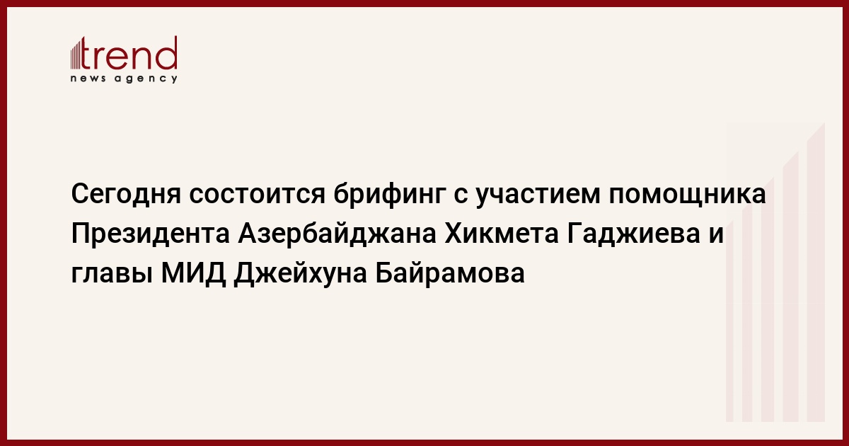БАКУ /Trend/ - Сегодня в МИД состоится брифинг с участием помощника Президента Азербайджана - заведующего отделом по вопросам внешней политики Администрации Президента Хикмета Гаджиева и министра иностранных дел Джейхуна Байрамова, сообщает в субботу Trend.