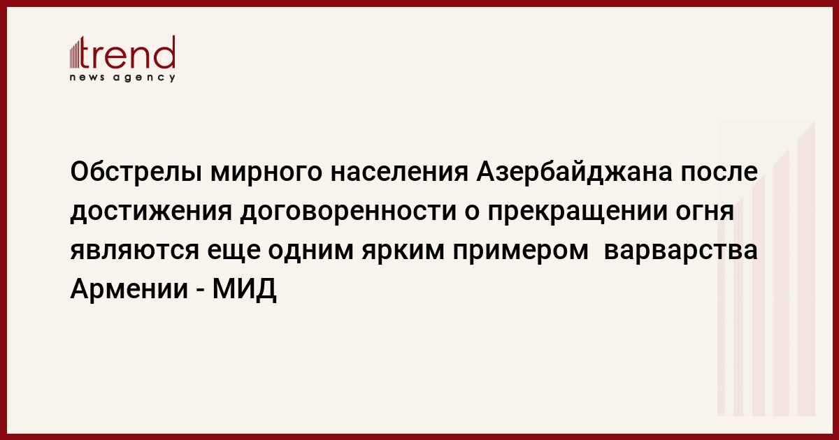 Обстрел мирных жителей и городов армянскими вооруженными силами после договоренности о прекращении огня в гуманитарных целях является еще одним ярким примером варварства Армении и показывает, что призывы ее руководства к прекращению огня являются ни чем иным, как лицемерием.