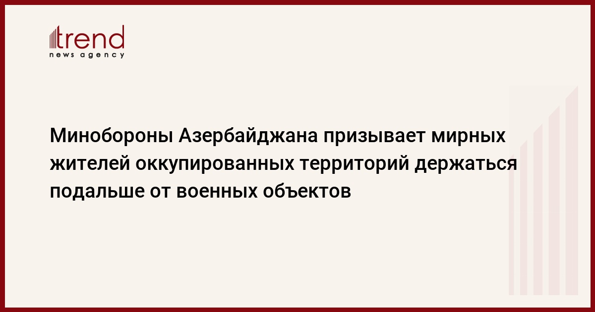 БАКУ /Trend/ - Военное командование Азербайджана, в очередной раз обращаясь к мирным жителям, проживающим в населённых пунктах, расположенных вблизи зоны боевых действий, рекомендует им держаться подальше от военных объектов и инфраструктуры во избежание травм и ранений, сообщает в субботу Trend со ссылкой на Минобороны Азербайджана.