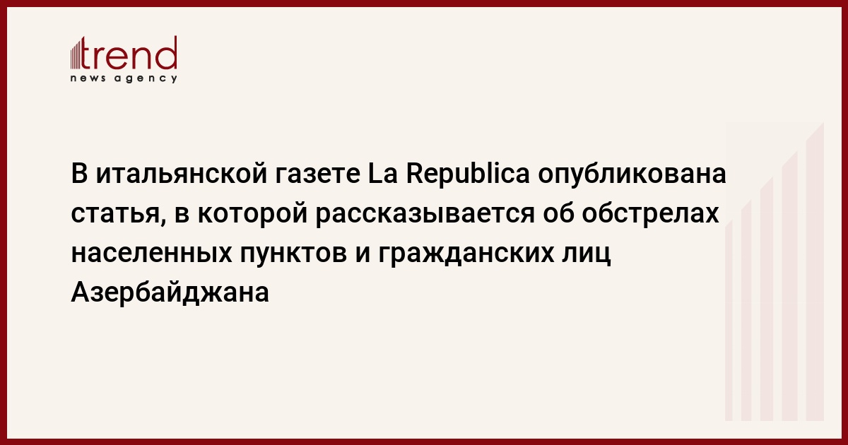 БАКУ /Trend/ - В итальянской газете La Republica опубликована статья Пьетро Дель Ре, в которой рассказывается о нагорно-карабахском конфликте, в частности об обстрелах населенных пунктов и гражданских лиц Азербайджана.