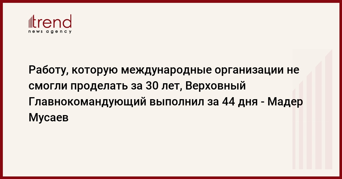 "Работу, которую международные организации не смогли проделать за 30 лет, Верховный Главнокомандующий выполнил за 44 дня. Глава государства решил этот вопрос таким образом, что виновные в пытках и убийствах мирных жителей, детоубийцы и преступники не смогут более взглянуть в сторону наших территорий. Пашинян, перед точкой которого был поставлен восклицательный знак, думал, что все ему сойдет с рук", - сказал Мусаев.