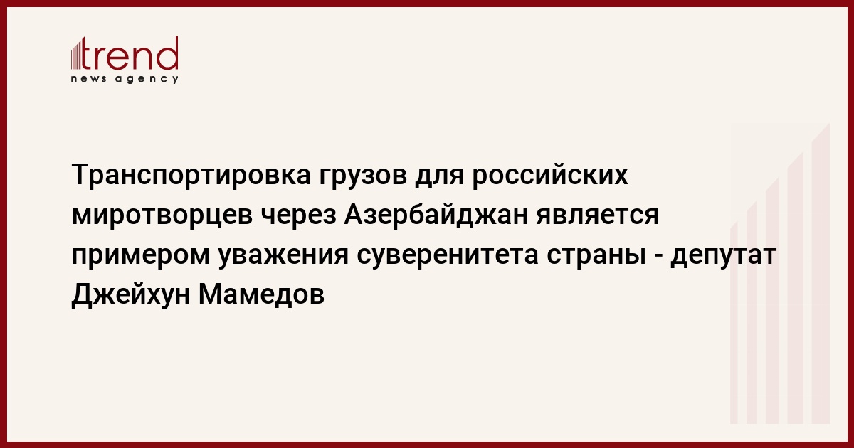 БАКУ /Trend/ - В соответствии с подписанным между Азербайджаном и Россией протоколом о размещении российского миротворческого контингента в Карабахском регионе осуществляется соответствующая деятельность. Правительство Азербайджана создает необходимые условия для транспортировки и доставки грузов российским миротворцам. Транспортировка этих грузов через Азербайджан также является примером уважения территориальной целостности и суверенитета нашей страны.