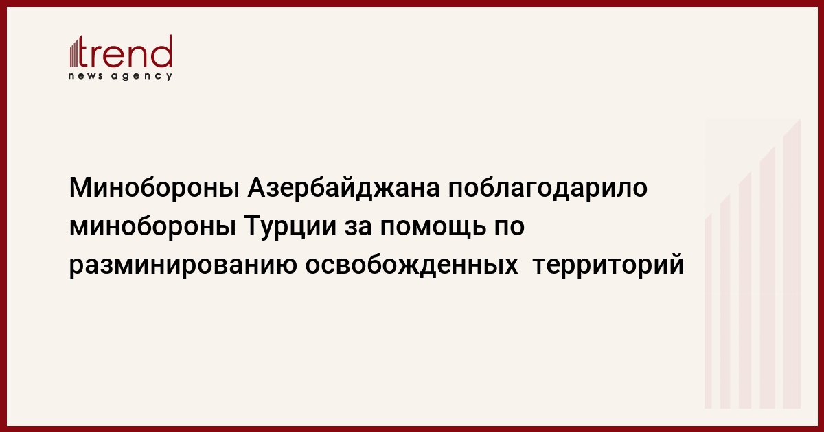 "Турецкие военные специалисты проведут работу по разминированию и очистке этих территорий от взрывных устройств, а также организуют учебные занятия для наших инженерных подразделений. Выражаем благодарность министерству национальной обороны братской Турции за оказанную поддержку", - говорится в сообщении минобороны Азербайджана.