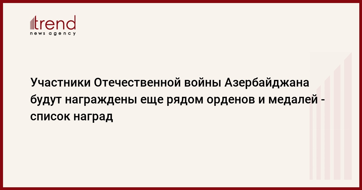 Награждения будут продолжены, и участники Отечественной войны будут удостоены медалей "Отважный боец", "За отличие в боях", "За освобождение Суговушана", "За освобождение Джебраила", "За освобождение Ходжавенда", "За освобождение Физули", "За освобождение Зангилана", "За освобождение Губадлы", "За освобождение города Шуша", "За освобождение Кельбаджара", "За освобождение Агдама", "За освобождение Лачина", "Участник Отечественной войны" и "За заслуги в тылу в Отечественной войне".