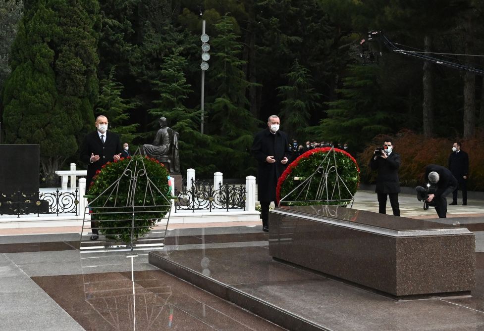 БАКУ / Trend/ - 10 декабря Президент Азербайджанской Республики Ильхам Алиев и находящийся с официальным визитом в нашей стране Президент Турецкой Республики Реджеп Тайип Эрдоган, прибыв на Аллею почетного захоронения, с уважением почтили память общенационального лидера нашего народа, архитектора и созидателя современного независимого азербайджанского государства Гейдара Алиева.