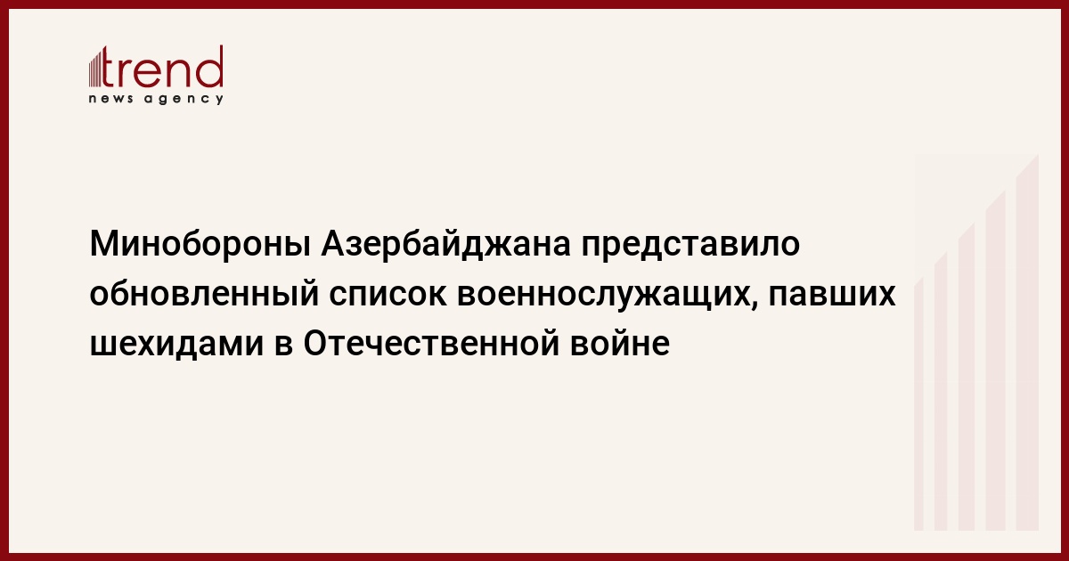 БАКУ /Trend/ - Министерство обороны Азербайджана представило к сведению фотографии, имена, фамилии, информацию о воинских званиях и дате рождения 2841 военнослужащего Вооруженных Сил Азербайджана, из числа павших шехидами в Отечественной войне и похороненных до 11 января, а также 64 военнослужащих, числящихся пропавшими без вести, сообщает в понедельник Trend.