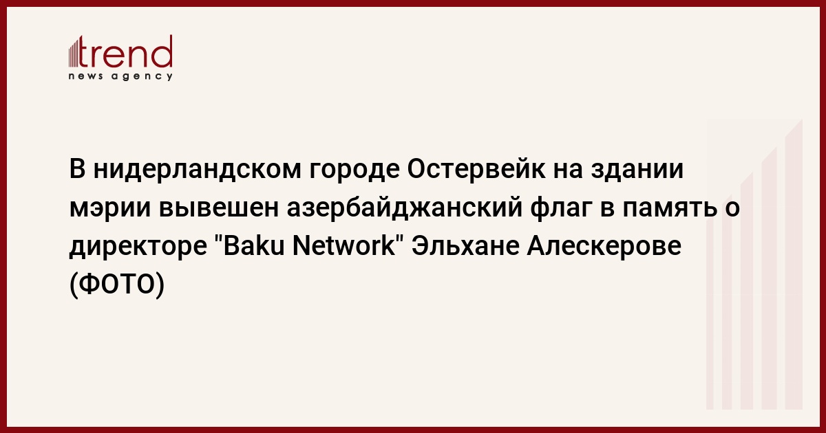 БАКУ /Trend/ - В нидерландском городе Остервейк по инициативе мэра Ханса Янсена на здании мэрии вывешен азербайджанский флаг в память о недавно скончавшемся директоре Экспертного совета "Baku Network", заместителе генерального директора АМИ Trend, докторе философии Эльхане Алескерове.