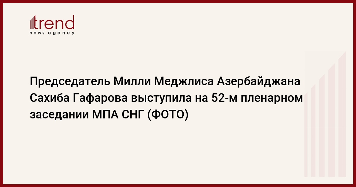 БАКУ /Trend/ - Находящаяся с рабочим визитом в Санкт-Петербурге (Россия) председатель Милли Меджлиса (парламента) Азербайджана Сахиба Гафарова 16 апреля выступила на 52-м пленарном заседании Межпарламентской ассамблеи СНГ.