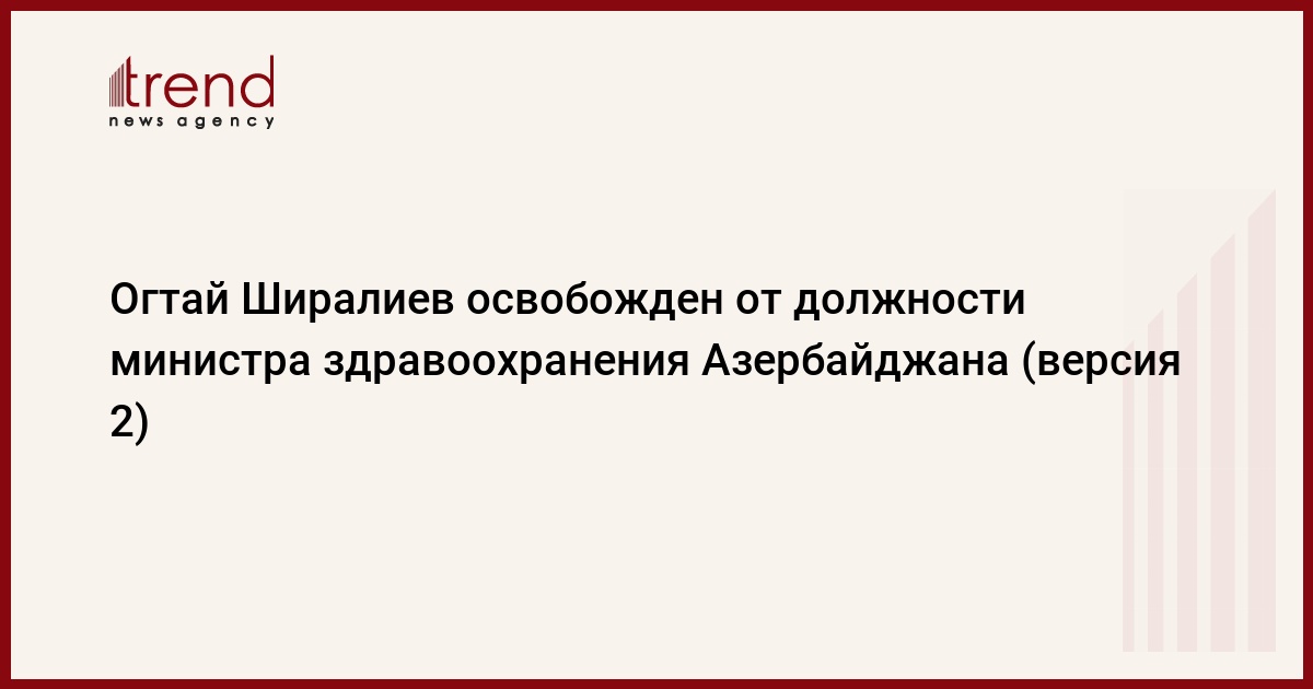 БАКУ /Trend/ - Президент Азербайджана Ильхам Алиев в пятницу подписал распоряжение об освобождении Огтая Казым оглу Ширалиева от должности министра здравоохранения.