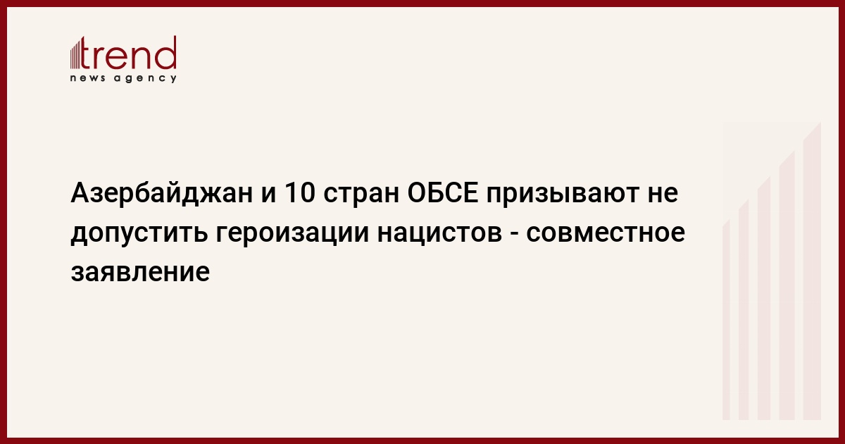 Азербайджан и 10 государств - участников ОБСЕ призывают бережно относиться к воинским захоронениям и мемориальным комплексам в честь погибших в борьбе с нацистами в годы Второй мировой войны и не допустить героизации нацистов. С таким совместным заявлением выступили в четверг постоянные представители Азербайджана, Армении, Беларуси, Боснии и Герцеговины, Казахстана, Кыргызстана, России, Сербии, Таджикистана, Туркменистана, Узбекистана при ОБСЕ по случаю 76-летия Победы во Второй мировой войне, передает Trend со ссылкой на ТАСС.