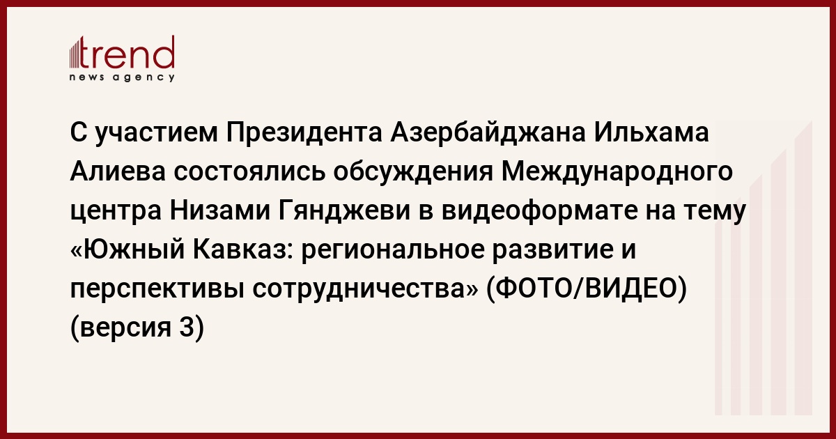 БАКУ /Trend/ - 20 мая с участием Президента Азербайджанской Республики Ильхама Алиева состоялись обсуждения Международного центра Низами Гянджеви в видеоформате на тему «Южный Кавказ: региональное развитие и перспективы сотрудничества».