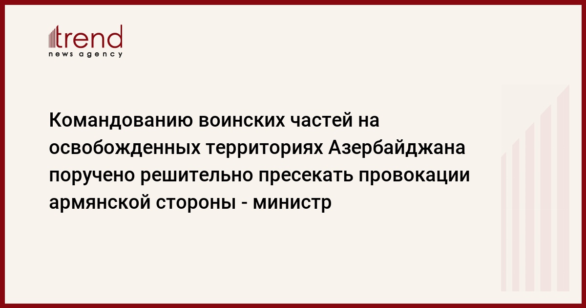 БАКУ / Trend/ - Командованию воинских частей, дислоцированных на освобожденных территориях Азербайджана, поручено предпринимать решительные шаги и незамедлительные меры по пресечению провокаций армянской стороны.