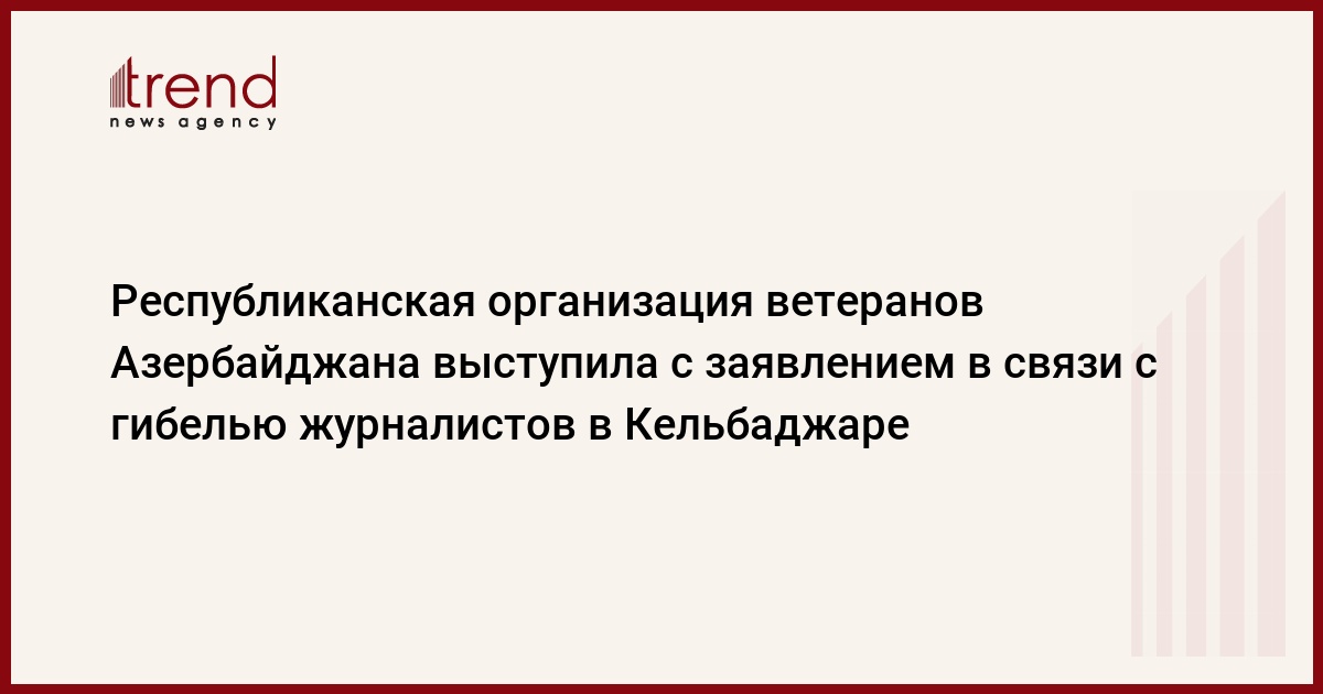 БАКУ /Trend/ - Президиум Республиканской организации ветеранов Азербайджана выступил с заявлением в связи с гибелью 4 июня корреспондента Азербайджанского государственного информационного агентства (АЗЕРТАДЖ) Магеррама Ибрагимова и оператора ЗАО «Азербайджанское телевидение и радиовещание» (AZTV) Сираджа Абышова в результате подрыва на мине при выполнении служебных обязанностей в Кельбаджарском районе.