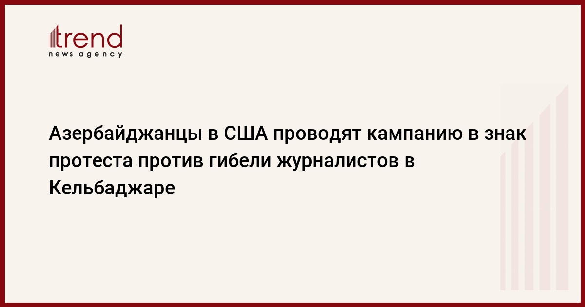 БАКУ /Trend/ - Сеть азербайджанцев США (U.S. Azeris Network) проводит кампанию в знак протеста против гибели четвертого июня двух азербайджанских журналистов и одного госслужащего в результате подрыва на мине в Кельбаджаре, сообщает в среду Trend со ссылкой на Госкомитет Азербайджана по работе с диаспорой.