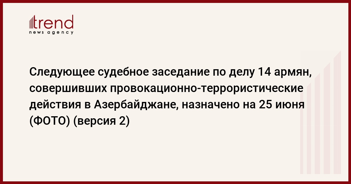 В Бакинском суде по тяжким преступлениям начался процесс по уголовному делу 14 членов армянских вооруженных формирований, совершивших провокационно-террористические и другие преступные действия в Азербайджане, сообщает в среду Trend.