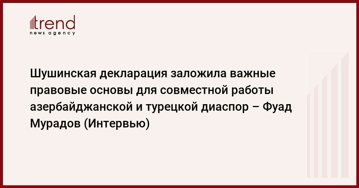 БАКУ /Trend/ - Председатель Государственного комитета по работе с диаспорой Фуад Мурадов ответил на вопросы Trend о совместной деятельности азербайджанской и турецкой диаспор и задачах, вытекающих из Шушинской декларации.