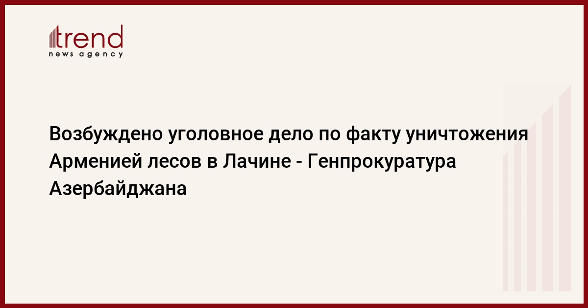 БАКУ /Trend/ - В Генеральной прокуратуре Азербайджана возбуждено уголовное дело по факту уничтожения Арменией лесов в Лачине, говорится в сообщении надзорного ведомства, передает в понедельник Trend.