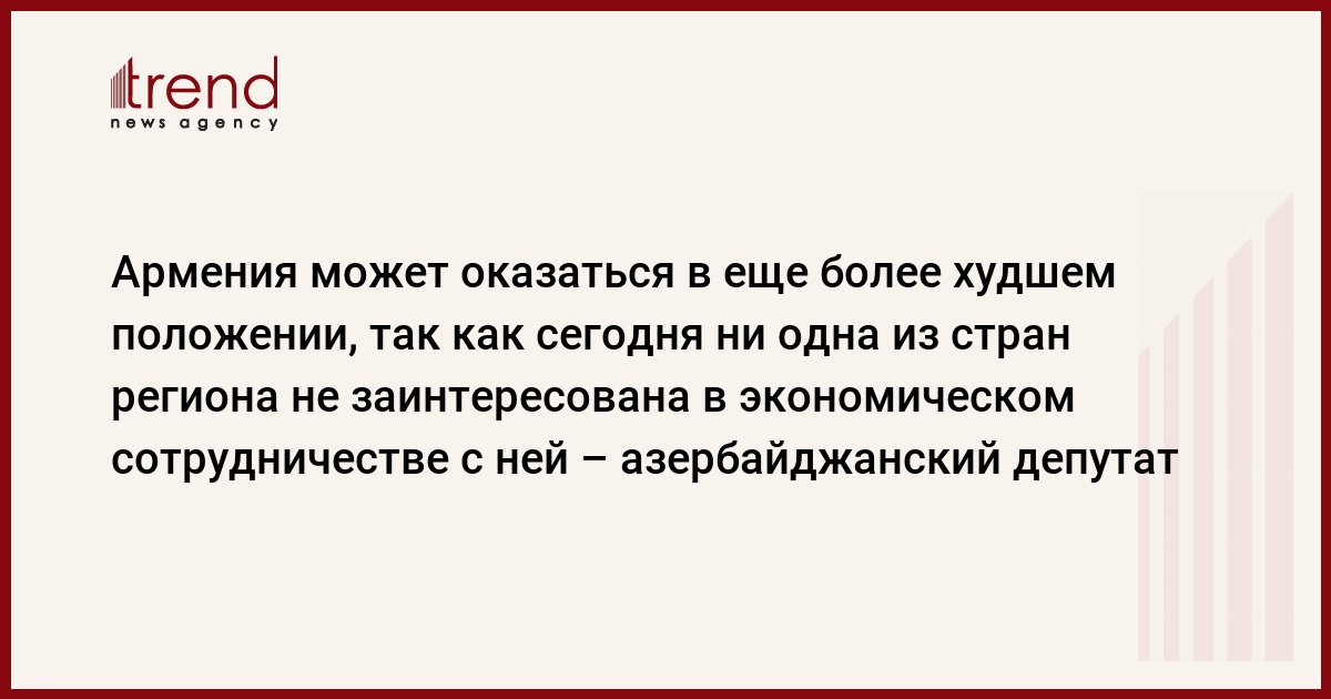 «Сегодня развитие региона по всем направлениям зависит от Азербайджана, а Армения практически вышла из игры. Но она может оказаться в еще более худшем положении, так как ни одна из стран региона не заинтересована в экономическом сотрудничестве с Арменией. Политика Азербайджана обеспечивает ему обязательное участие во всех региональных проектах. Было бы хорошо, если бы Армения начала проводить работу по определению границ с Азербайджаном, создала рабочую группу по делимитации и стала готовиться к подписанию мирного соглашения. Как отметил Президент Азербайджана, Армения должна выбросить в архив термин "Нагорный Карабах", потому что такого понятия не существует. Железный кулак Верховного главнокомандующего уничтожил это понятие раз и навсегда. Армения должна отойти от враждебной позиции и наладить нормальные отношения со своими соседями. В результате 30-летней захватнической политики она попала в зависимое от других стран положение. Сегодня Армения превратилась в государство, неспособное проводить независимую политику», – сказал депутат.