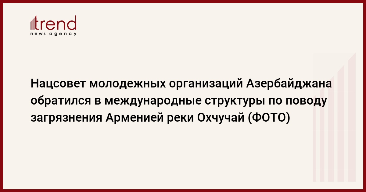 Как сообщает в субботу Trend, молодежные организации Азербайджана в своем обращении акцентировали внимание международного сообщества на постоянном загрязнении трансграничной реки Охчучай Арменией и том факте, что это напрямую угрожает качеству водных ресурсов, используемых азербайджанским населением.