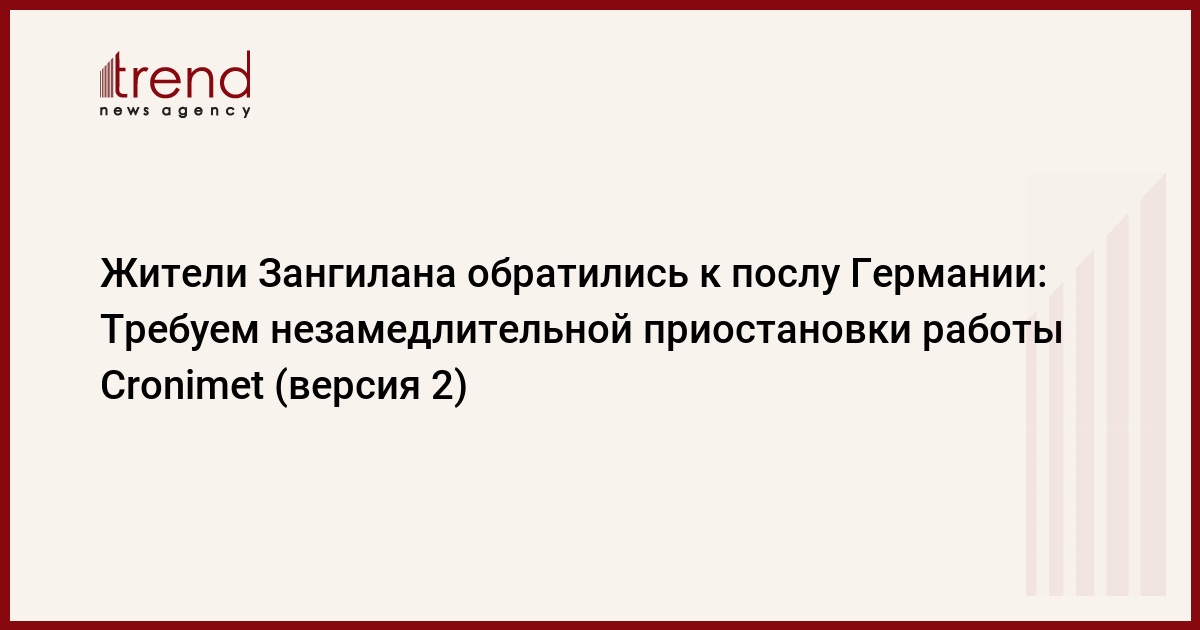 Теперь воду из реки нельзя использовать для орошения, кроме того, в ней гибнет вся рыба. Мы, зангиланцы, требуем прекращения экологического террора, совершаемого на наших исконных землях. Мы призываем Германию, страну экологических стандартов, принять срочные меры против Cronimet, ставшей причиной возникновения угрозы для других стран.