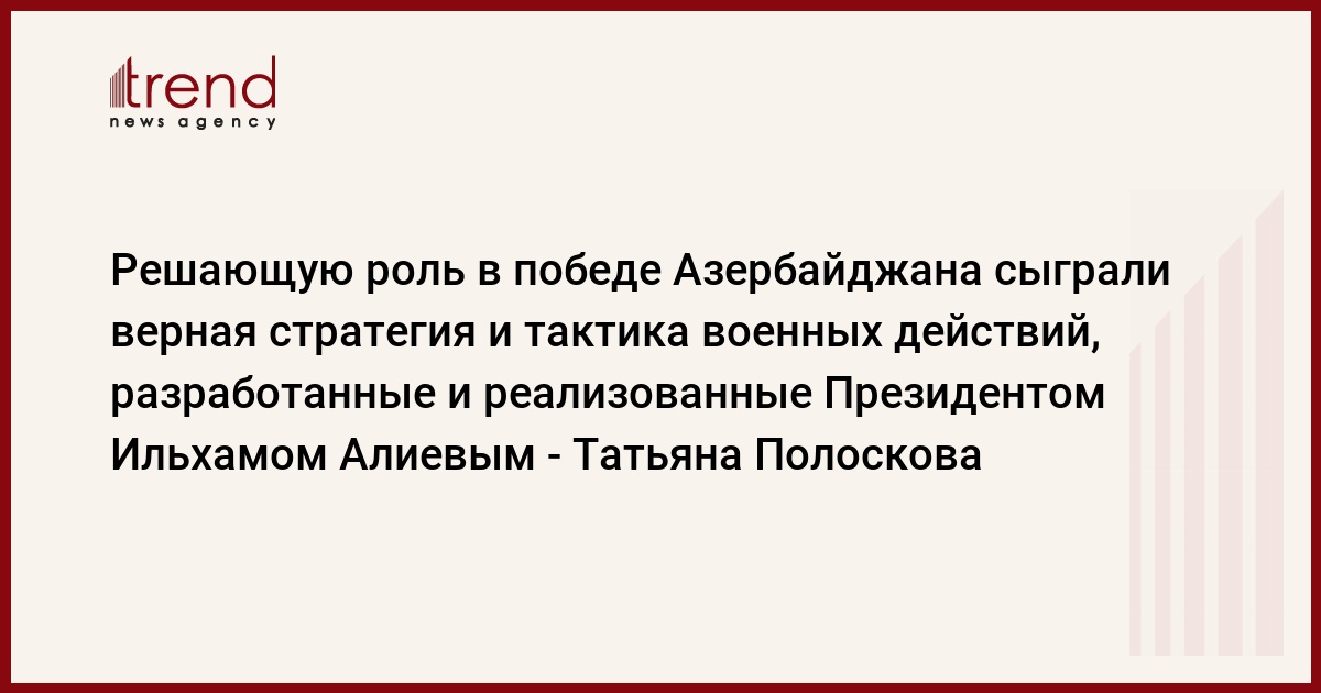 "Меня особенно впечатлила операция по освобождению города Шуша. Эта война не могла не закончиться победой Азербайджана, поскольку страна и ее народ боролись за правое дело. А в таких случаях победить народ невозможно. На Южном Кавказе восторжествовали закон и справедливость. Мы все знаем, что Армения оккупировала территории Азербайджана вопреки правовым нормам, презрев требования ООН и элементарную человеческую порядочность. После победы Азербайджана в Отечественной войне качественно изменилась геополитическая ситуация в регионе. Азербайджан заявил о себе как о лидере на Южном Кавказе, а Турция - как о мощной стране региона с потенциалом серьезного мирового игрока. Именно стратегический союз Турции и Азербайджана сейчас является гарантом стабильности и позитивных изменений на Южном Кавказе", - сказала Полоскова.