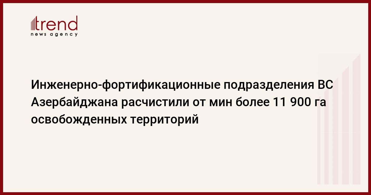 БАКУ /Trend/ - Инженерно-фортификационные подразделения азербайджанской армии совместно с военными саперами Турции расчистили от мин более 11 900 га освобожденных территорий Азербайджана, сообщает в среду Trend со ссылкой на минобороны Азербайджана.