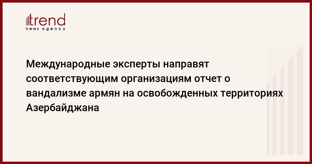БАКУ /Trend/ - Акты армянского вандализма на освобожденных территориях Азербайджана будут задокументированы международными экспертами на основании фотофактов и видеоматериалов, и эта информация в виде отчета будет направлена в соответствующие организации.