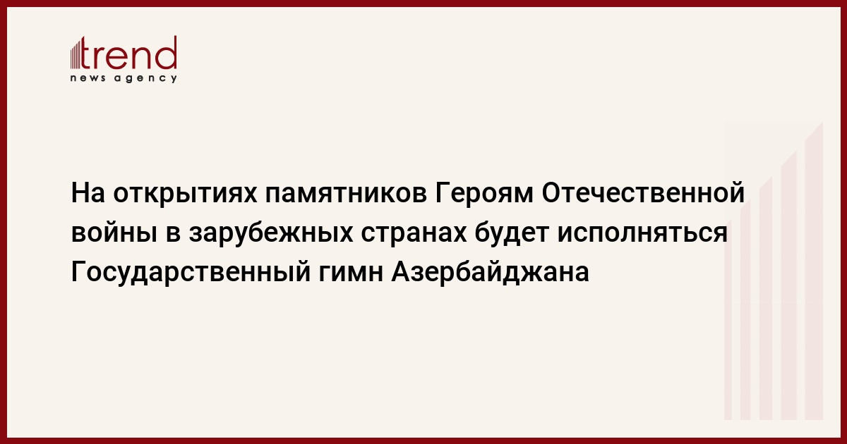 Как передает в среду Trend, согласно изменению, отныне Государственный гимн Азербайджана будет исполняться на территории иностранного государства и на открытиях мемориальных досок и памятников Героям Отечественной войны Азербайджана.