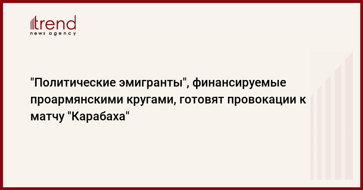 БАКУ /Trend/ - Как известно, в рамках Лиги конференций УЕФА 9 декабря в швейцарском Базеле состоится ответный матч местного футбольного клуба "Базель" с азербайджанским "Карабахом". Не исключено, что на стадионе будут провокации со стороны ряда черносотенцев, проживающих в некоторых европейских странах, выдающих себя за "политических эмигрантов", но на самом деле финансируемых и поддерживаемых проармянскими кругами.