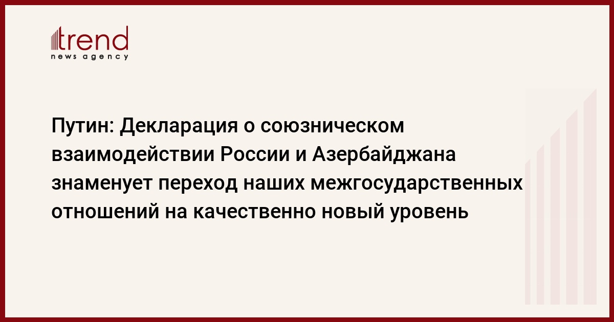 «И весьма символично, что Декларация о союзничестве подписана в год 30-летия установления официальных дипломатических связей между Россией и Азербайджаном. За прошедшие десятилетия российско-азербайджанское сотрудничество заметно укрепилось и расширилось, наполнилось многими конкретными взаимовыгодными проектами в политической, экономической и гуманитарной сферах. И мы, безусловно, настроены на дальнейшее всемерное развитие по-настоящему тесного союзнического взаимодействия с опорой на прочные традиции дружбы, добрососедства, взаимного уважения и учёта интересов друг друга.