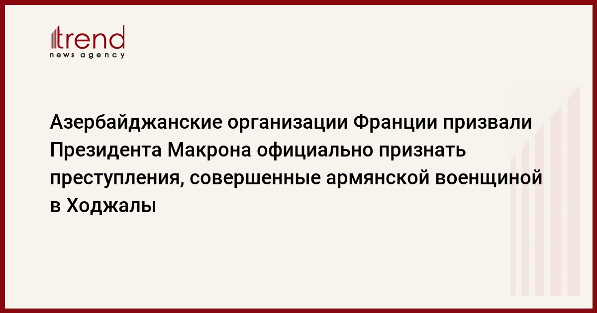 БАКУ /Trend/ - Азербайджанские диаспоральные организации Франции обратились с открытым письмом к Президенту Эммануэлю Макрону и призвали его официально признать преступления, совершенные армянской военщиной в Ходжалы и дать им политическую и юридическую оценку.