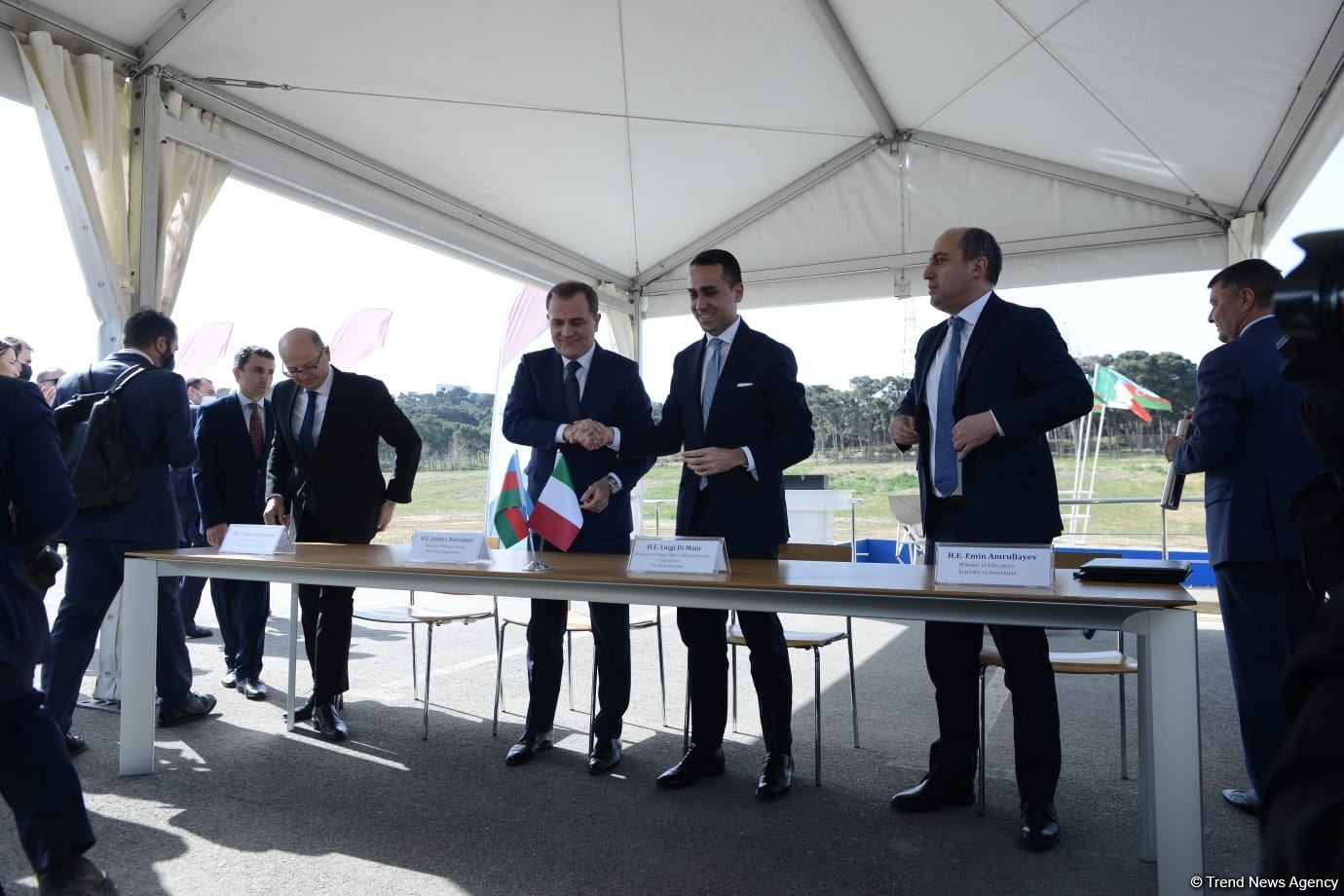 В церемонии закладки фундамента здания итальяно-азербайджанского университета приняли участие министр иностранных дел Азербайджана Джейхун Байрамов, министр энергетики Азербайджана Парвиз Шахбазов, министр образования Азербайджана Эмин Амруллаев и министр иностранных дел Италии Луиджи Ди Майо.