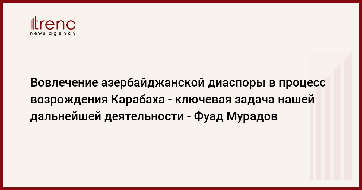 «Основное место в программе нашей будущей деятельности занимает вовлечение азербайджанской диаспоры в процесс возрождения Карабаха на этапе Победы. Цель заключается в том, чтобы внимание и забота азербайджанцев мира, наших соотечественников, а также представителей диаспор, дружественно относящихся к Азербайджану, были направлены на строительство в Карабахе, чтобы азербайджанцы, имеющие большие возможности для бизнеса в различных странах, вкладывали инвестиции в свою родину. Для этого совместно с министерством экономики проводится практическая работа. Как сказал Президент Ильхам Алиев, «все граждане Азербайджана, все проживающие за рубежом азербайджанцы знают, что за ними стоит сильное Азербайджанское государство», - сказал Мурадов.