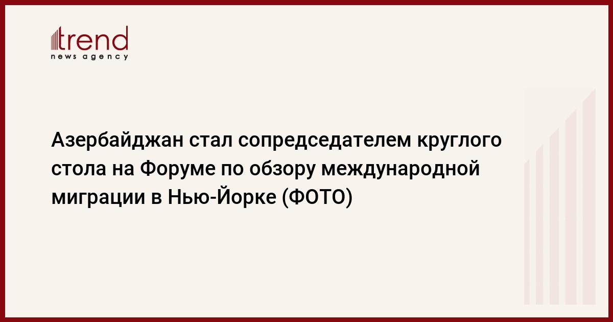 БАКУ /Trend/ - В рамках первого Форума по обзору международной миграции, проходящего 17-20 мая в штаб-квартире ООН в Нью-Йорке, организованы четыре интерактивных многосторонних круглых стола, посвященных 23 целям Глобального пакта по миграции и рассмотрению опыта, приобретенного на всех уровнях по реализации данного пакта.