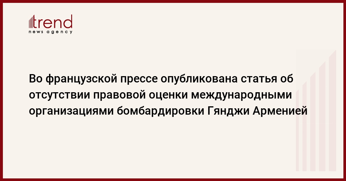 БАКУ /Trend/ - На французском новостном портале La Gazette опубликована статья, посвященная вопросам, связанным со второй годовщиной систематических террористических атак на мирное население Гянджи со стороны военно-политического руководства Армении, и тем, что международные организации до сих пор не дали правовой оценки этим преступлениям.