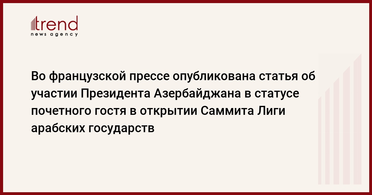 БАКУ /Trend/ - На французском новостном портале La Gazette опубликована статья об участии Президента Ильхама Алиева в качестве председателя Движения неприсоединения в статусе почетного гостя на 31-м Саммите Лиги арабских государств в столице Алжирской Народной Демократической Республики - Алжире.