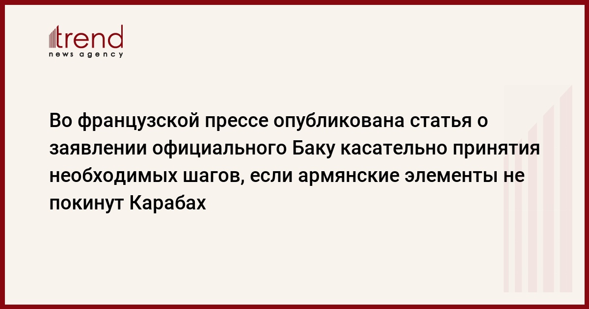 БАКУ /Trend/ - На французском новостном портале "La Gazette" опубликована статья под названием «Официальный Баку предпримет необходимые шаги, если армянские элементы не покинут Карабах».