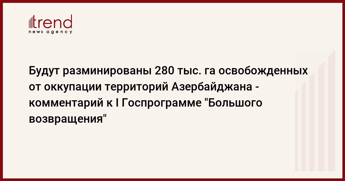 Согласно I Государственной программе "Большого возвращения", к 2026 году будет разминировано 280 тысяч гектаров освобожденных территорий. В соответствии с Планом мероприятий, Агентство Азербайджана по разминированию будет осуществлять эту задачу совместно с министерствами внутренних дел, обороны, министерством по чрезвычайным ситуациям. При этом в 2022-2025 годах должно быть проведено разминирование 215 тысяч га территорий.