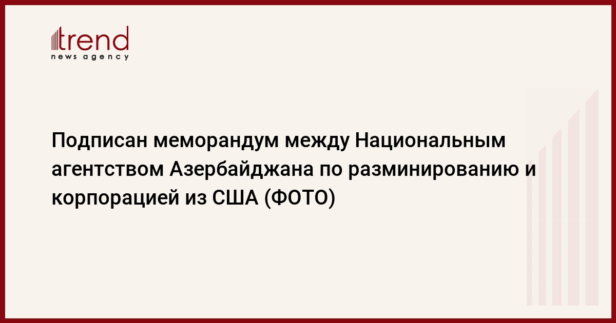 БАКУ /Trend/ - Между Национальным агентством Азербайджана по разминированию и американской Международной аэрокосмической инженерной корпорацией (IAEK) подписан меморандум о взаимопонимании по сотрудничеству в области очистки от мин и неразорвавшихся снарядов.