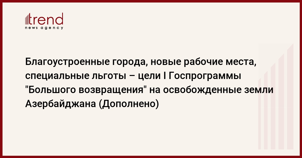 БАКУ /Trend/ - Подписанная Президентом Ильхамом Алиевым I Государственная программа "Большого возвращения" содержит много важных моментов, связанных с быстрым развитием освобожденных от оккупации земель и их устойчивым заселением.