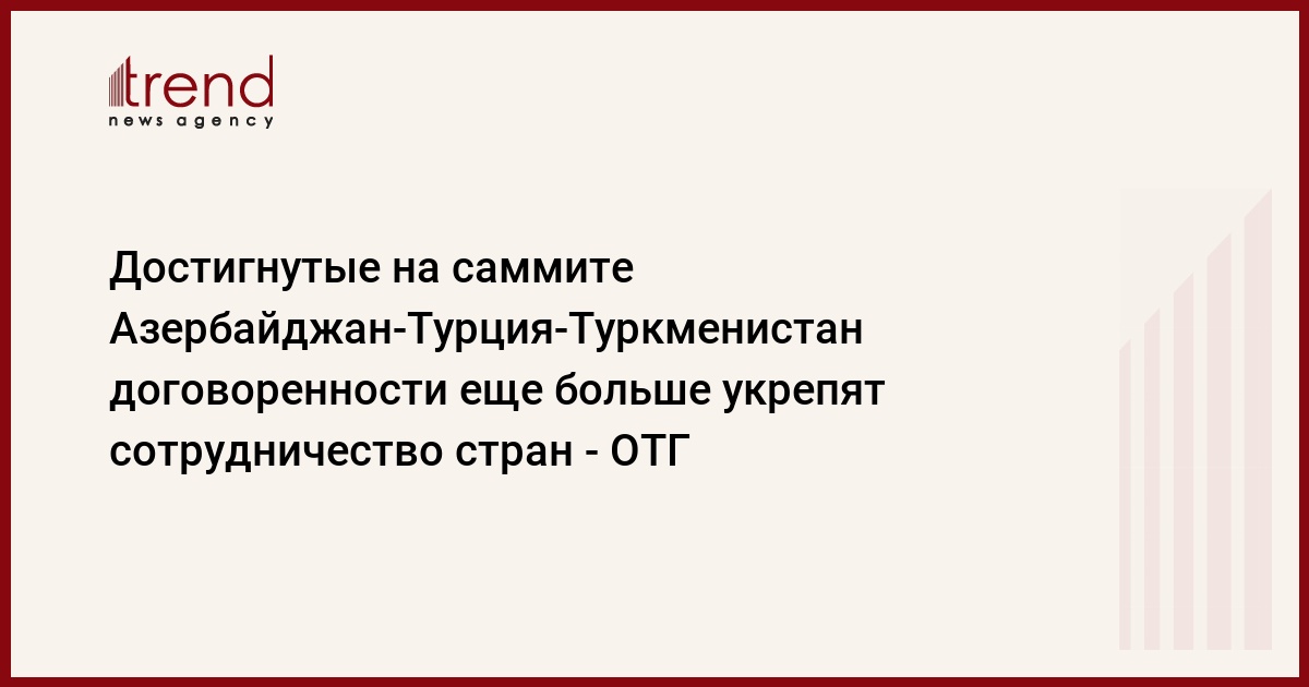 В заявлении отмечается, что этот саммит является очень важной возможностью для трех братских народов по укреплению связей между ними, для того, чтобы поддержать работу, реализуемую для обеспечения еще более светлого будущего для тюркского мира. Достигнутые между лидерами Азербайджана, Турции и Туркменистана договоренности и подписанные документы, несомненно, будут способствовать дальнейшему укреплению всестороннего сотрудничества в рамках ОТГ и повышению взаимодействия.
