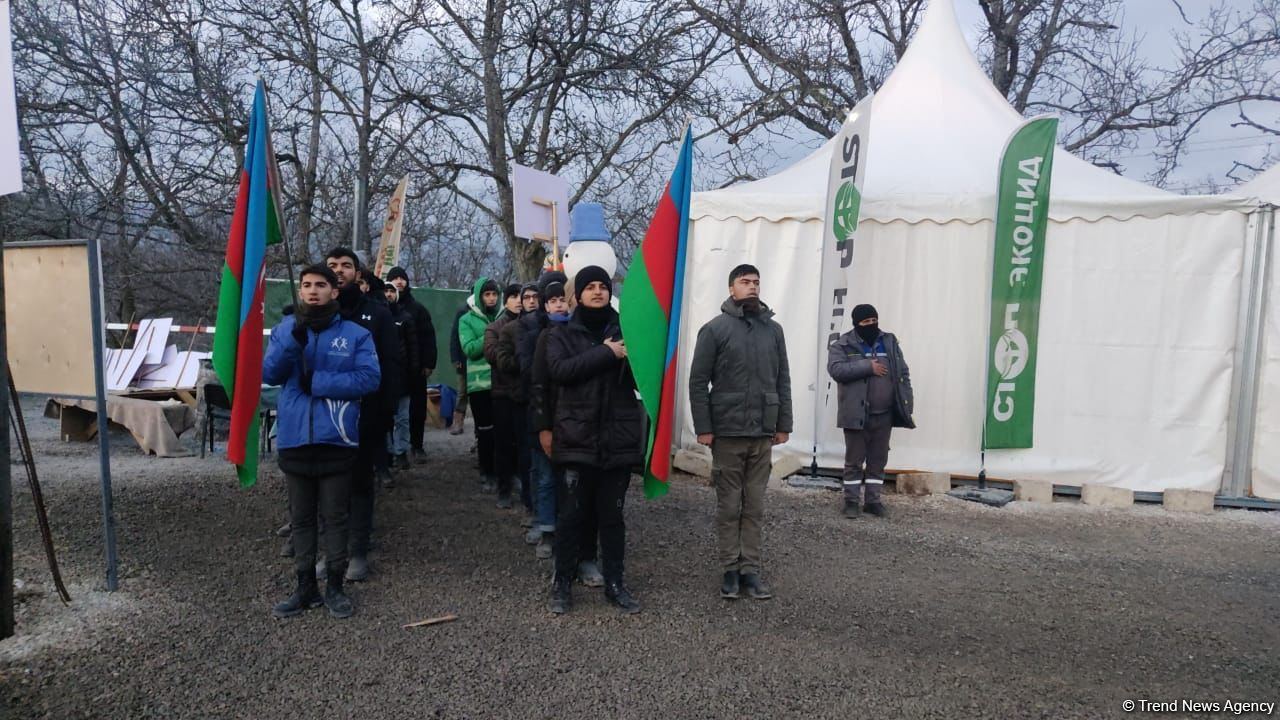 Сотрудник Trend, командированный в Шушу, сообщает в воскресенье, что несмотря на холодную погоду, участники акции продолжают свой протест. Экоактивисты начали день исполнением Государственного гимна Азербайджанской Республики.