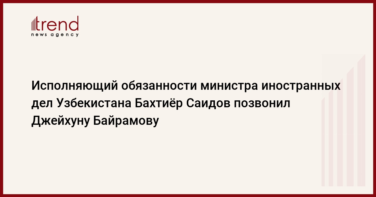 БАКУ /Trend/ - Исполняющий обязанности министра иностранных дел Республики Узбекистан Бахтиёр Саидов позвонил министру иностранных дел Азербайджана Джейхуну Байрамову в связи с террористической атакой 27 января 2023 года на посольство Азербайджана в Иране.