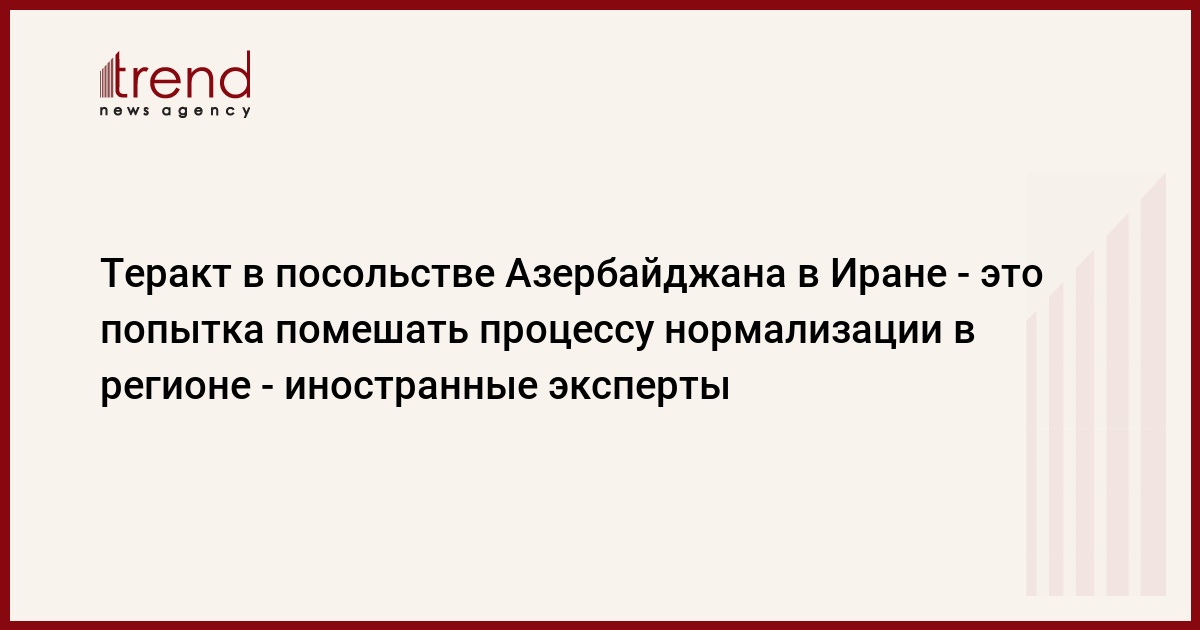 БАКУ /Trend/ - Иностранные эксперты и журналисты расценивают теракт, совершенный в посольстве Азербайджана в Иране, как попытку помешать процессу установления мира и нормализации в регионе.