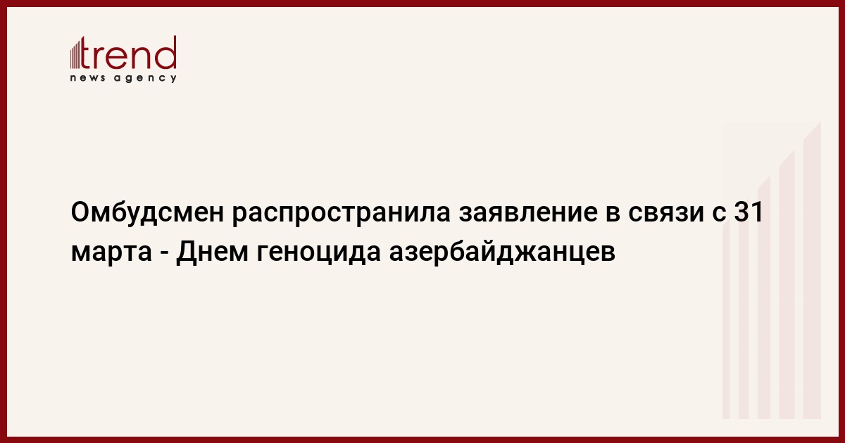 БАКУ /Trend/ - Уполномоченный по правам человека (Омбудсмен) Азербайджана Сабина Алиева распространила заявление в связи с 31 марта - Днем геноцида азербайджанцев, сообщает в четверг Trend.