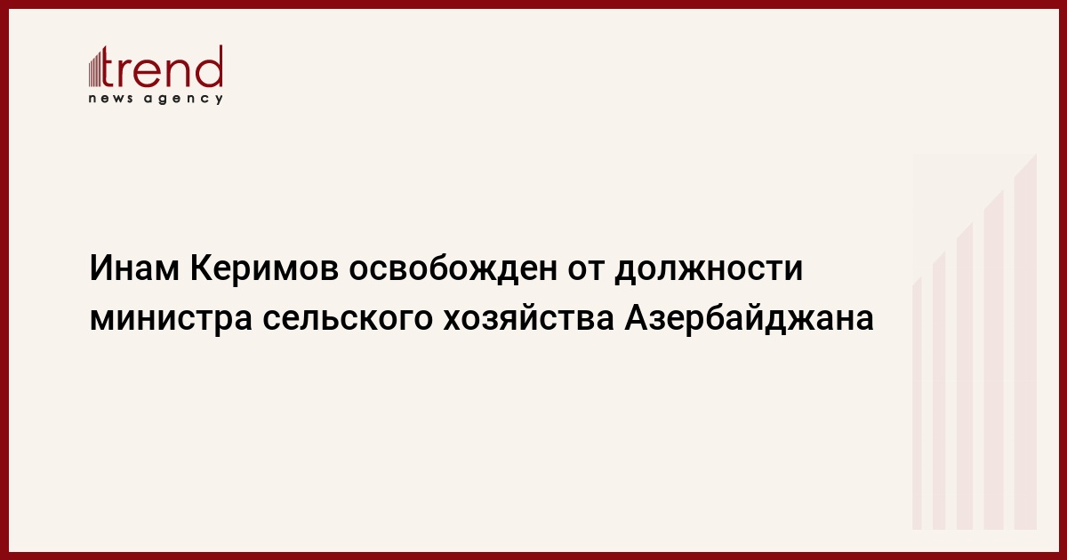 БАКУ /Trend/ - Инам Имдад оглу Керимов освобожден от должности министра сельского хозяйства Азербайджана.