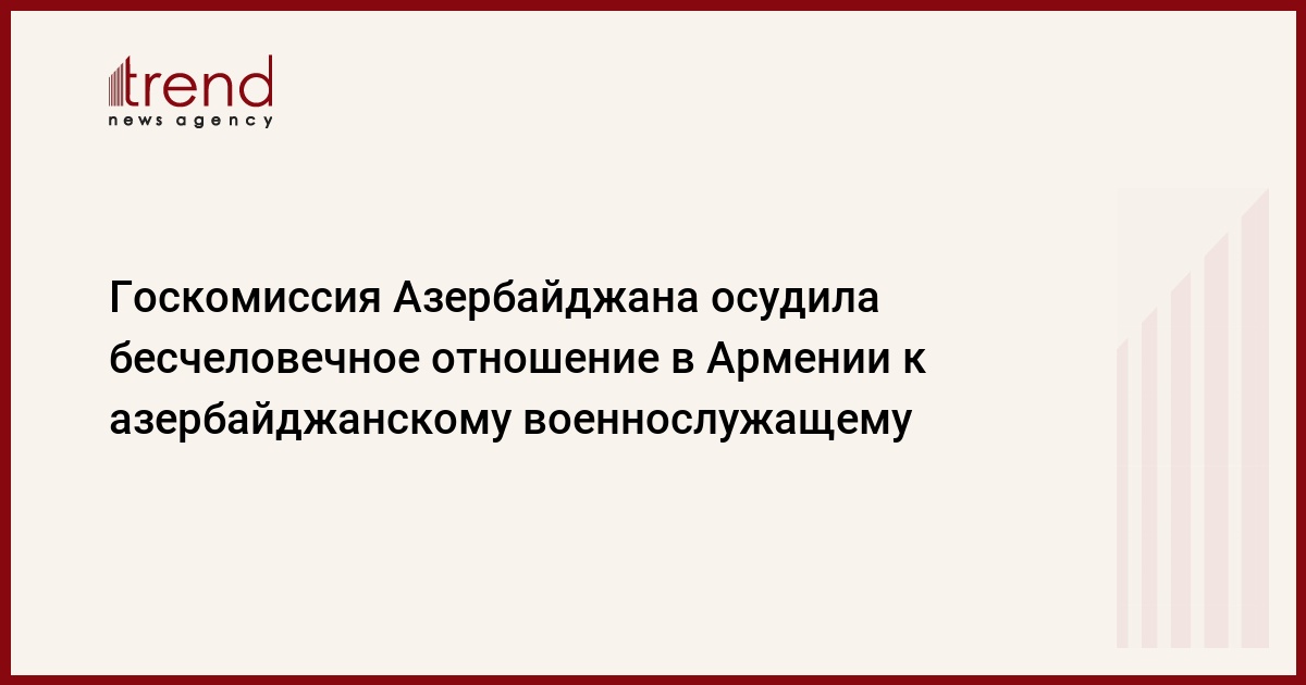 БАКУ /Trend/ - Государственная комиссия по делам военнопленных, заложников и пропавших без вести граждан Азербайджана, расценивая применение в Армении пыток в отношении солдата Гусейна Ахундова как факт грубого нарушения Женевских конвенций от 12 августа 1949 года, решительно осуждает эту жестокость армянской стороны и требует обращения с пленным в соответствии с нормами международного гуманитарного права.