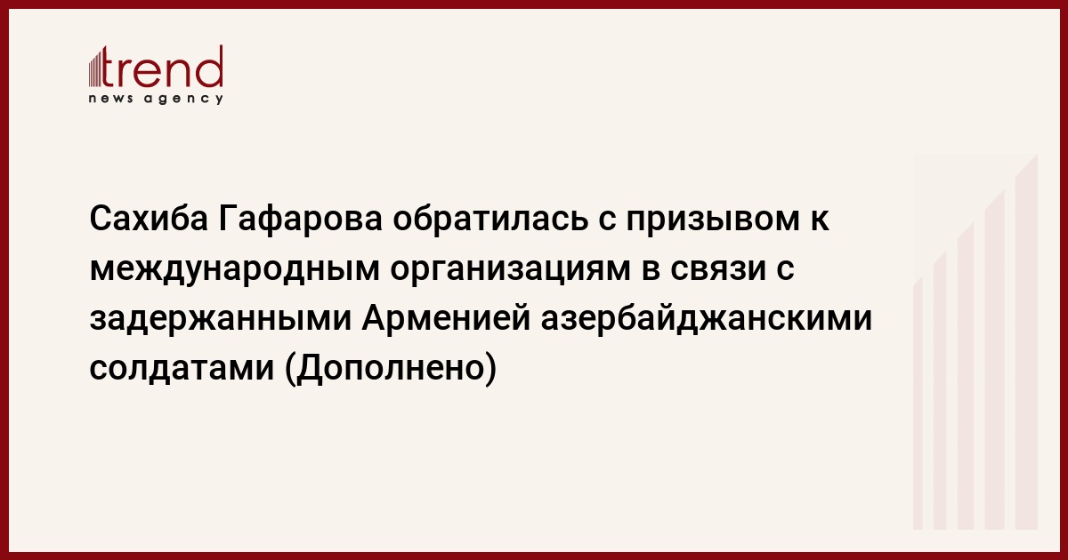 Как сообщили в пятницу Trend в Милли Меджлисе, Гафарова отметила, что несколько дней назад Армения задержала двух азербайджанских военнослужащих, ранее пропавших без вести на границе. Сразу же в социальных сетях стали распространяться видеозаписи, демонстрирующие физические пытки и бесчеловечное обращение с ними. Соответствующие международные организации должны расследовать данное насилие и дать этому надлежащую оценку, сказала спикер.