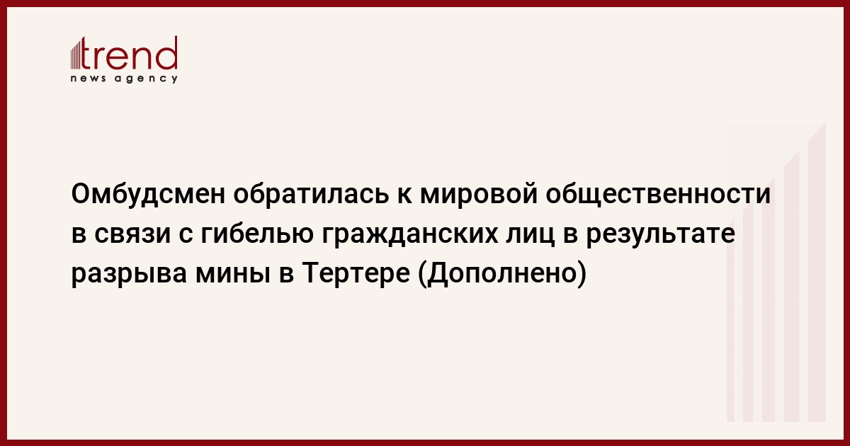 БАКУ /Trend/ - Уполномоченный по правам человека (омбудсмен) Азербайджана Сабина Алиева обратилась к мировой общественности в связи с фактом гибели гражданских лиц в результате разрыва мины, произошедшего в Тертере.