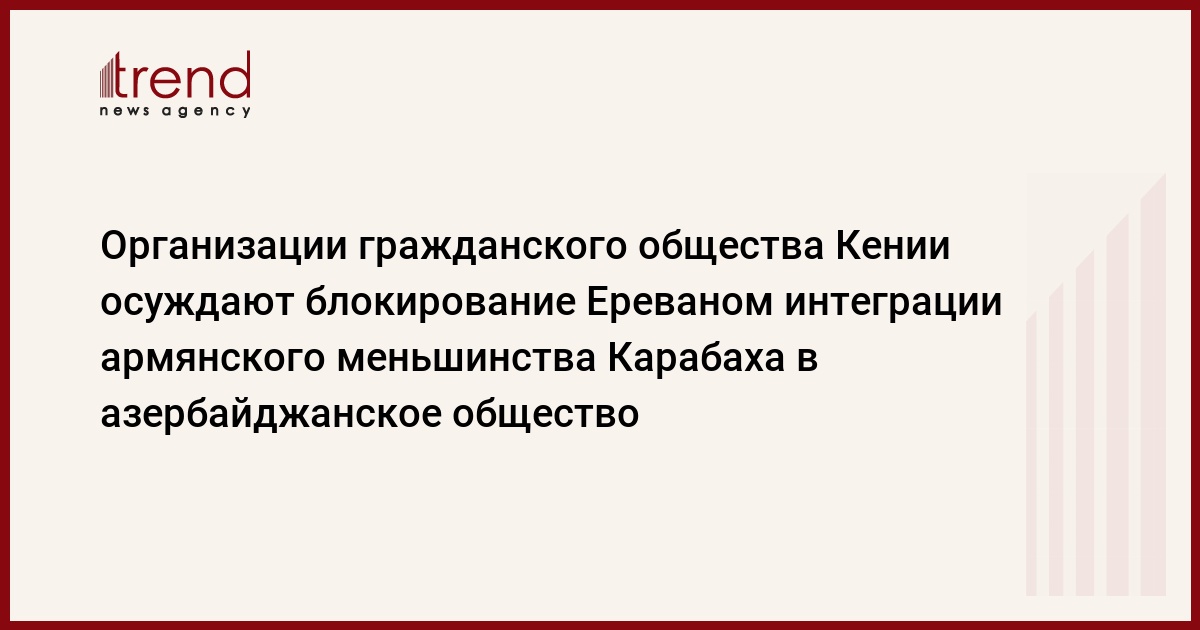 БАКУ /Trend/ - Организации гражданского общества Кении выступили с заявлением, осуждающим блокирование Ереваном интеграции армян, проживающих в Карабахском регионе Азербайджана, в азербайджанское общество, сообщает в среду Trend.
